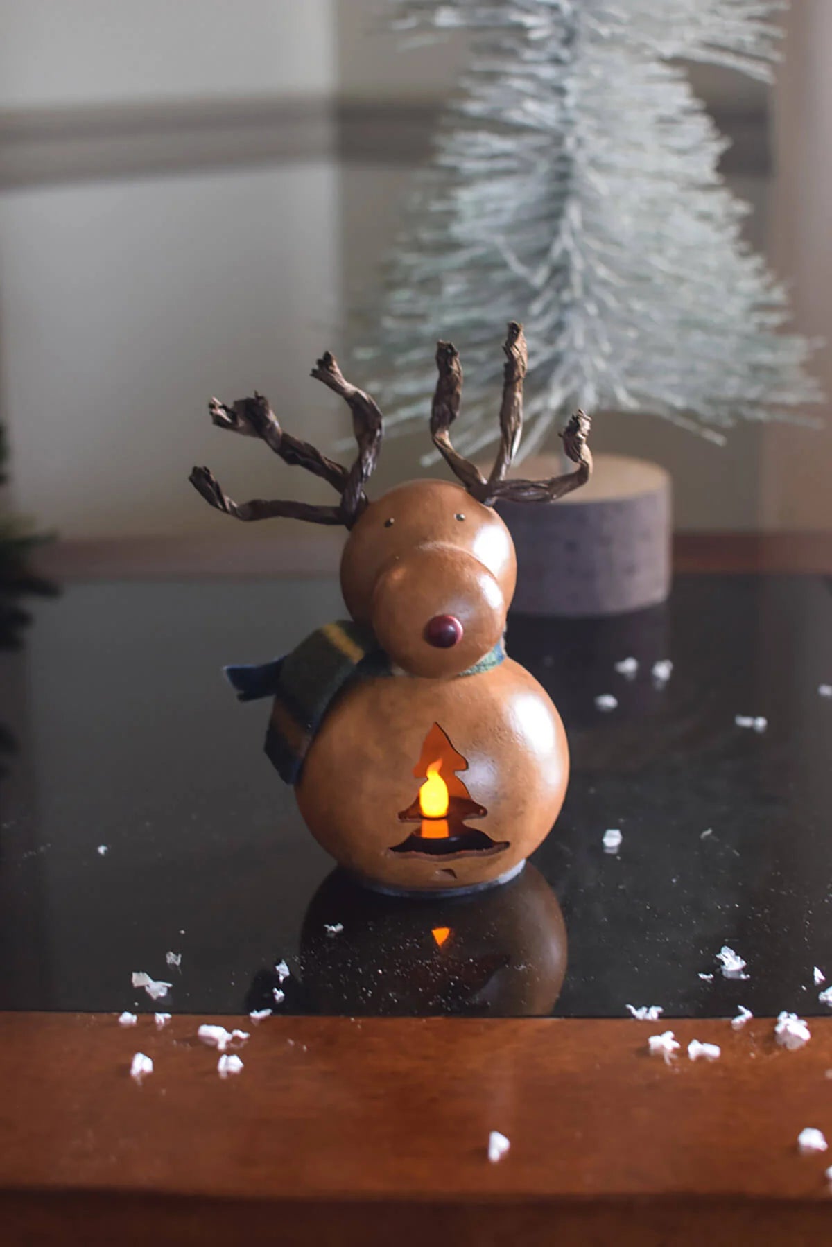 This adorable gourd reindeer is caramel in color and has a cute tree cut out. He has brown antlers, a red wooden nose and a winter scarf. It can be lit by purchasing a battery-operated tea light. This reindeer is approximately 3 1/2” in diameter and 7 1/2" tall.
