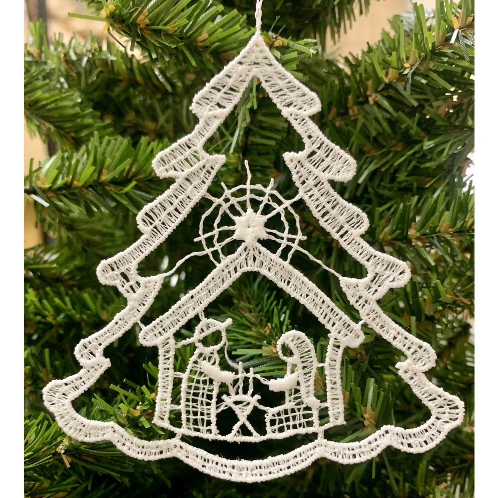Nativity Scene Inside White Lace Christmas Tree
